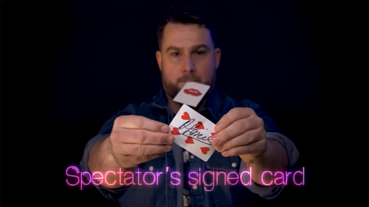 A card is chosen and signed by a spectator. You lost this card in the deck. Then you show a card with a single mouth printed on it, you put it face down on the spectator's hand. You snap your fingers as a magic pass then the spectator turns the card face up, there is a folded printed card in the mouth now. You take this card and you visually extract the printed folded card, actually it becomes real. You unfold the card, this is the spectator's signed card.
