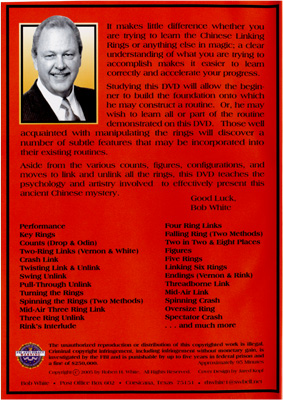 Aside from the various counts, figures, configurations and moves to link and unlink all the rings, this DVD teaches the psychology and artistry involved to effectively present this ancient Chinese mystery.