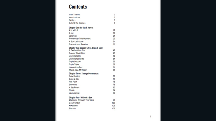 "Within these pages you'll find routines where coins travel into and out of the box, silver coins transform into, or transpose with other coins, time travelling props, coins that shrink and how about a routine where a normal ending for a box routine, unexpectedly happens in the middle twice! These are just a few examples of Nev's thinking on the coin box.