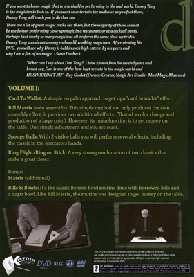 There are a lot of great magic tricks out there, but the majority of them cannot be used when performing close-up in a restaurant or at a cocktail party. Perhaps that is why so many magicians all perform the same close-up tricks. Danny Tong stands out among real world, working magicians. After viewing his DVD, you will see why Danny is held in such high esteem by his peers and why I am a fan of his magic."
